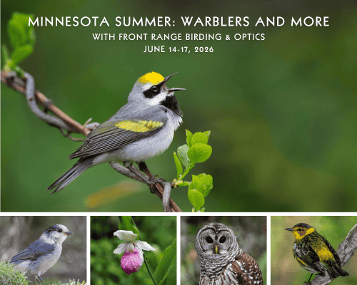 This four-day journey celebrates the richness of Minnesota’s boreal summer. We’ll explore a diversity of northern habitats, from black spruce bogs and tamarack forests to lakeshore trails and the rugged North Shore, all bursting with life at this time of year. Warblers are the stars of the show, with possibilities including golden-winged, mourning, Canada, and Connecticut, among others. We’ll also keep an eye out for a host of other boreal breeders such as boreal chickadee, evening grosbeak, and barred owl.